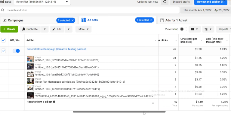 If you want to see which image is getting the best CTRs, it will break it down here. You can do the same for text, or headlines and see for example which text is getting you the cheapest cost per clicks, best CTRs