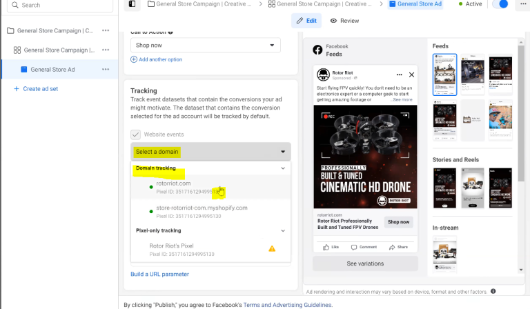 – Fb doesn’t select domain automatically, so when launching new ad select the domain as shown in the screenshot below